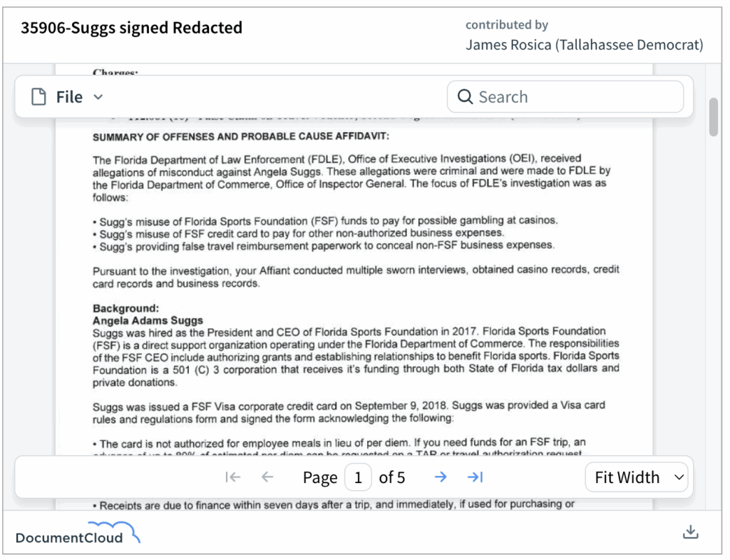 According to the arrest affidavit, Suggs allegedly misused over $24,000 while at the foundation. On June 10, 2025, she turned herself in at the Leon County Detention Facility and was charged with grand theft, scheme to defraud, and four misdemeanors related to falsifying travel vouchers. She was released the same day on $13,500 bond.