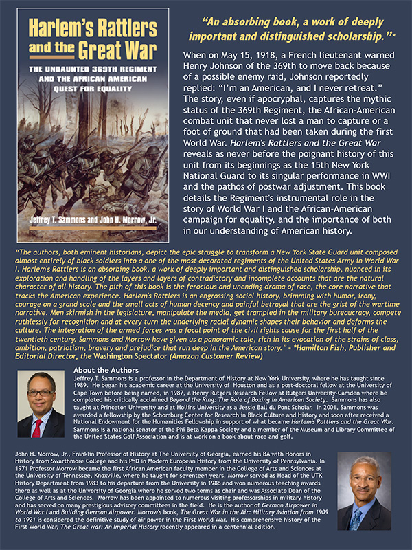 One of my fond childhood memories is the enormous sense of pride and gratification I received from standing on a Harlem street corner as the gleaming steel-helmeted men of the 369th Regiment paraded up Seventh Avenue at the end of their annual two-week summer encampment in upstate New York. Some of the men were neighbors, others were relatives of playmates, all were my heroes and I felt privileged to pay homage to them. Decades later those memories were rekindled as I made my way through the pages of Harlem’s Rattlers and the Great War.
