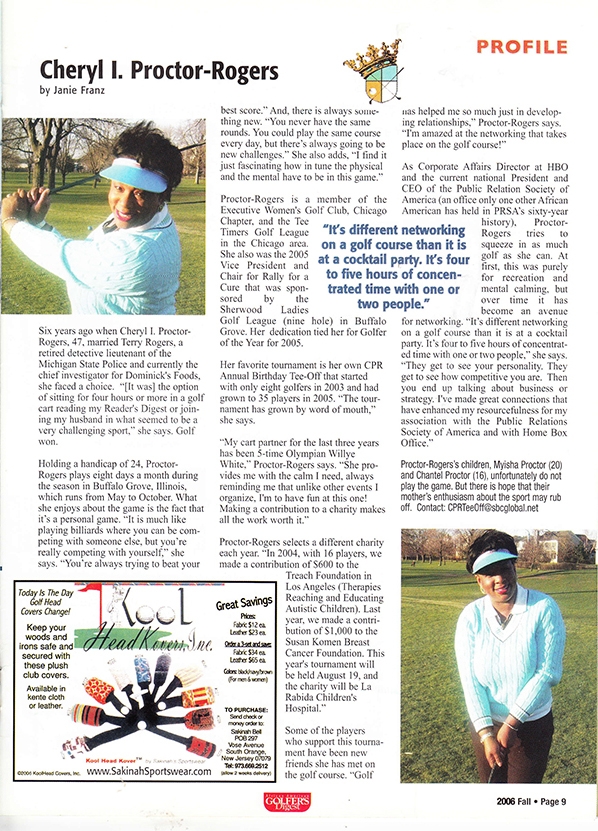 Proctor-Rogers is a member of the Executive Women’s Golf Club, Chicago Chapter, and the Tee Timers Golf League in the Chicago area. She also was the 2005 Vice President and Chair for Rally for a Cure that was sponsored by the Sherwood Ladies Golf League (nine hole) in Buffalo Grove. Her dedication tied her for Golfer of the Year for 2005.