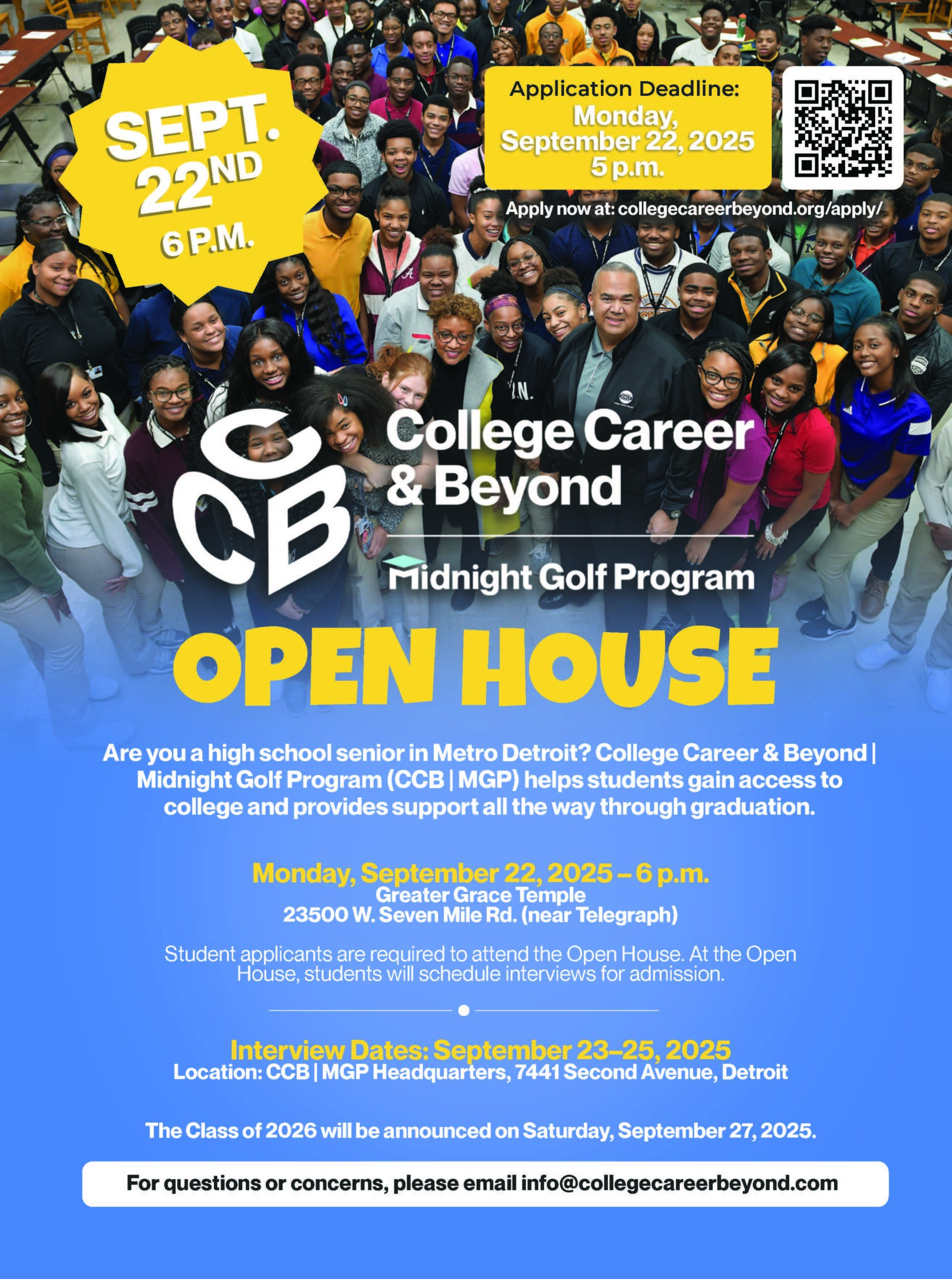 With up to 2,000 expected applicants, the process begins at the mandatory Open House on Sept. 22 at 6 p.m. at Greater Grace Temple, 23500 W. Seven Mile Rd., near Telegraph. All student applicants must attend the mandatory open house as the first step in the selection process. The deadline to apply is Sept. 22 at 5 p.m.