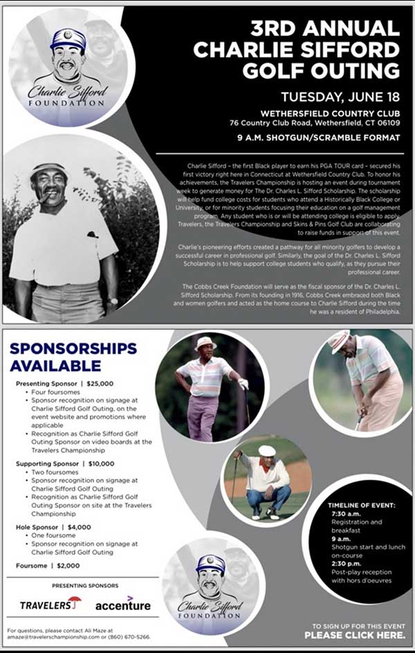 3rd Annual Charlie Sifford Golf Outing by AAGD Staff June 18, 2024 written by AAGD Staff June 18, 2024 Date/Time Date(s) - 06/18/20249:00 am - 6:00 pm Location Wethersfield Country Club FOR MORE INFORMATION CONTACT info@travelerschampionship.com 0 comment 0 FacebookTwitterPinterestEmail AAGD Staff previous post Diverse Educational Life Training Activities 2nd Annual Golf Tournament next post Salute To Our Heroes Golf Tournament Leave a CommentYou must be logged in to post a comment.