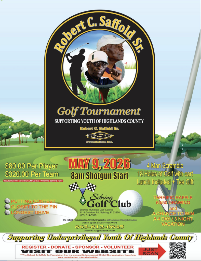 The Annual Robert C. Saffold Sr. Memorial Charity Golf Tournament will be held on May 10, 2025, SUPPORTING UNDERPRIVILEGED YOUTH OF HIGHLANDS COUNTY. Please note that we have made some changes for this year’s tournament. The biggest change for this tournament is the location, we will be hosting this year’s tournament at The Sebring Golf Club, 3113 Golfview Road, Sebring Fl. 33875. The other change for this tournament is the Registration Deadline is 48 hours before tee time.