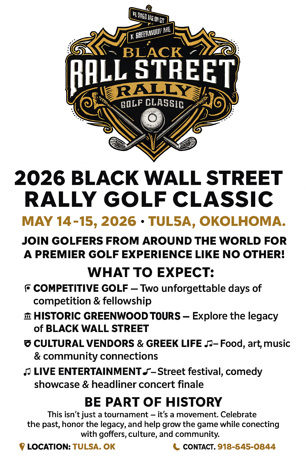 Black Wall Street Rally Golf Classic by AAGD Staff May 14, 2026 written by AAGD Staff May 14, 2026 Date/Time Date(s) - 05/14/2026 - 05/15/20267:00 am - 7:00 pm Location Belcher Golf Course 0 comment 0 FacebookTwitterPinterestEmail AAGD Staff previous post The John Shippen National Invitational Golf Tournament next post Monday Before The Show —2026 LPGA Legend Honoree is Wendy Boyd!