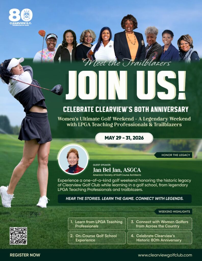 Join us for a historic gathering of minority women in golf from across the country as we celebrte National Women’s Golf Day. You’ll enjoy this marvelous celebration of the 80th Anniversary of the historic Clearview Golf Course while playing challenging golf and networking with new friends. For more information visit https://www.clearviewgolfclub.com/events