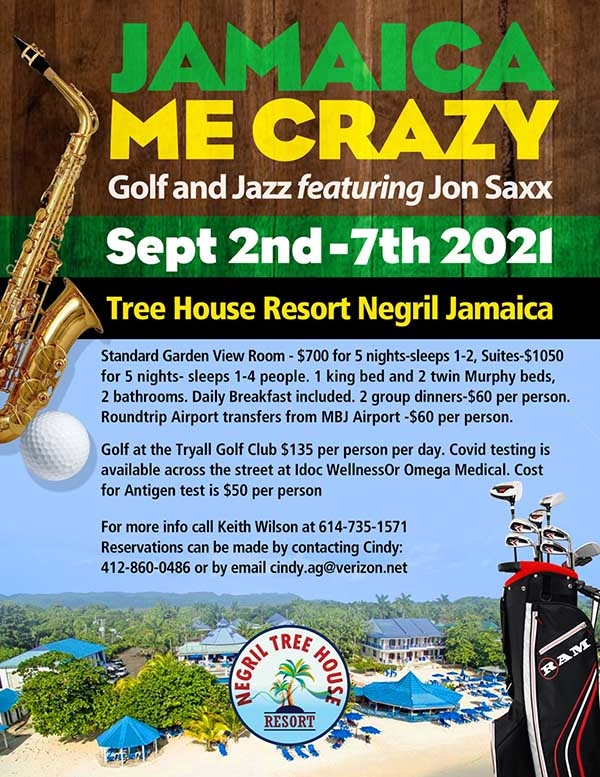 Jamaica Me Crazy Golf & Jazz featuring Jon Saxx by Debert Cook September 2, 2021 written by Debert Cook September 2, 2021 Date/Time Date(s) - 09/02/2021 - 09/07/2021All Day Location Negril Treehouse For more information contact Keith Wilson at (614) 735-1571 Reservations can be made by contacting Cindy at (412) 860-0486 or email [email protected] 0 comment 0 FacebookTwitterPinterestEmail Debert Cook previous post Inaugural 2021 Langston’s Axe golf Tournament next post W.E.S.T. Golf Club Skins Game
