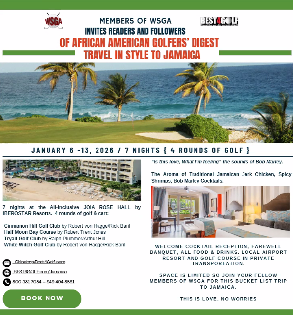 Members of WSGA Invites Readers & Followers to Travel in Style to Jamaica by AAGD Staff January 6, 2026 written by AAGD Staff January 6, 2026 Date/Time Date(s) - 01/06/2026 - 01/13/2026All Day Location Joia Rose Hall by Iberostar Resorts Website: http://jamaica.best4golf.com 0 comment 0 FacebookTwitterPinterestEmail AAGD Staff previous post Members of the WSGA Invites You to Travel In Style to Jamaica next post Senegal Jazz Festival