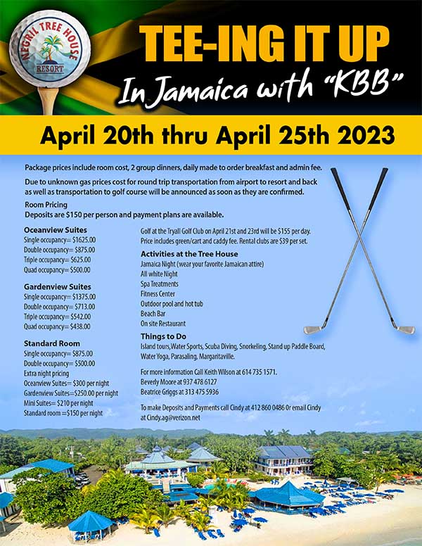 TEE-ING IT UP In Jamaica 2023 With KBB by AAGD Staff April 20, 2023 written by AAGD Staff April 20, 2023 Date/Time Date(s) - 04/20/2023 - 04/25/2023All Day Location Negril Treehouse TO BOOK & FOR MORE INFORMATION CALL (214) 418-4232 To make Deposits and Payments call Cindy at (412) 860-0486 0r email Cindy at Cindy.ag@verizon.net 0 comment 1 FacebookTwitterPinterestEmail AAGD Staff previous post OHBM 15th Annual Dr. Roscoe C. Brown Golf Classic next post HCCI Inaugural Golf Invitational