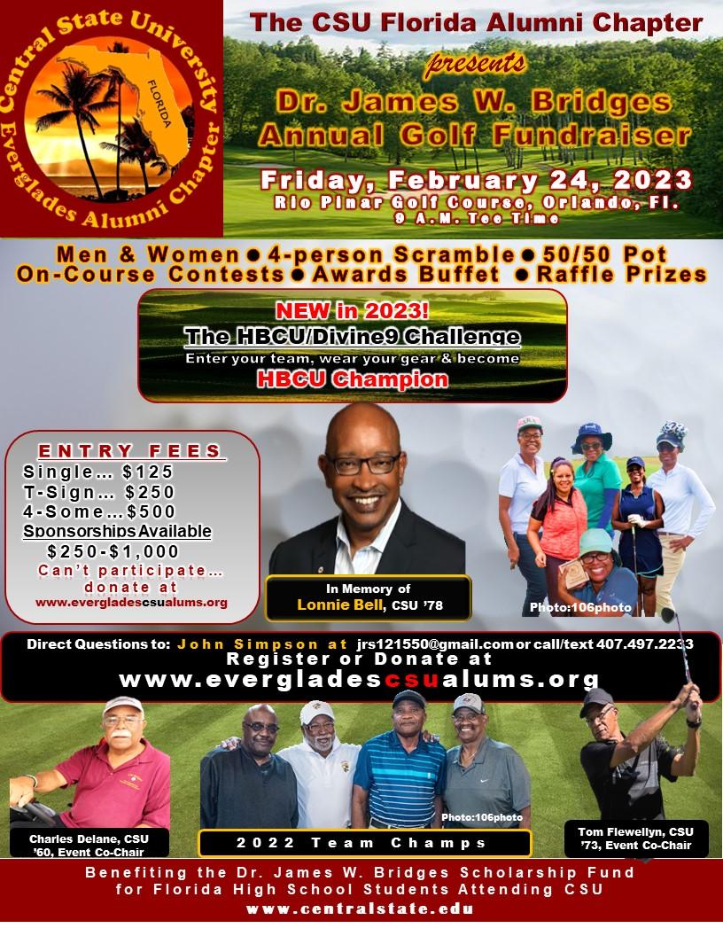 The Dr. James W. Bridges golf fundraiser was started by Charles Delane (CSU 60’) over 20 years ago as a way for CSU alumni residing in Florida to network and play golf during the annual Florida Everglades Alumni chapter’s “Weekend of Tropical Elegance” meetings. The Weekend of Tropical Elegance was originally held during President’s Day holiday weekend, where the alumni gather to discuss university issues, meet with / recruit potential students seeking a college degree and enjoy socializing with fellow alumni and friends.