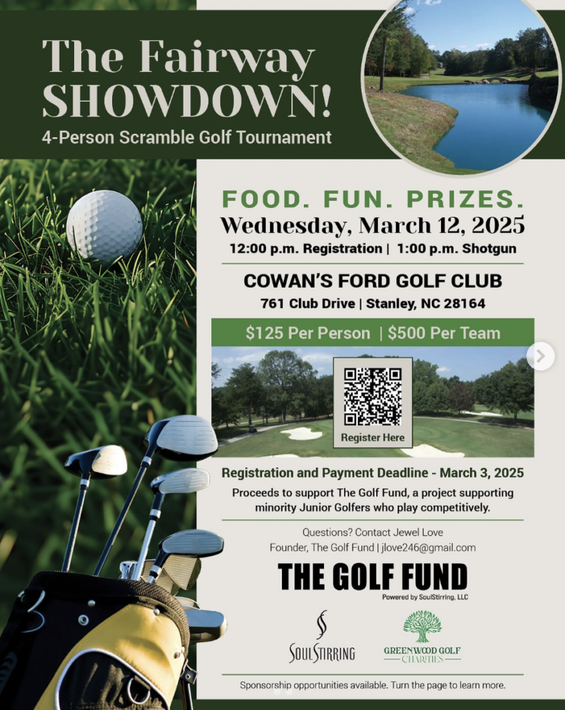 The Golf Fund, based in Rockhill, NC, was established by Jewel Love in 2023. The program is not only breaking barriers in golf but also creating a lasting impact on the next generation of minority golfers—one tournament at a time. These efforts have already yielded tangible results with four juniors who played with The Golf Fund go off to college on scholarships to play golf. Ms. Love invites all to attend for a day of fun, camaraderie and challenge. For more information contact Jewel Love at jlove246@gmail.com and follow on Instagram at @TheGolfFund.