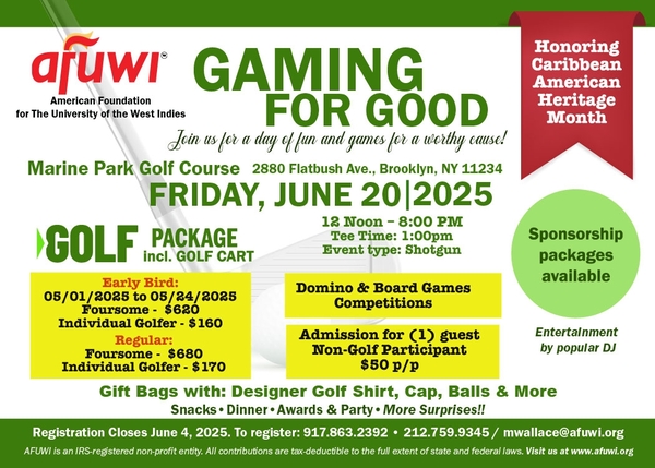 This summer, golfers and supporters of education alike will gather for a special occasion with purpose behind every swing. The Gaming for Good Golf Open, hosted by the American Foundation for The University of the West Indies (AFUWI), is more than just a sporting event—it’s a heartfelt effort to change lives through education. The 2025 tournament will be held on Friday, June 20, 2025, at Marine Park Golf Course, 2880 Flatbush Ave., Brooklyn, NY.