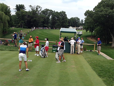 Final pairing of leader Amy Wang and Stacy Lewis on number 6 tee box. Amy had just bogeyed number 5 and Stacy double bogeyed. Amy bounced back strong on holes 6 and 7 with back-to-back birdies to grab a comfortable 3 shot lead. Co-Leaders Gee Chun and Shiho Oyama, playing in the