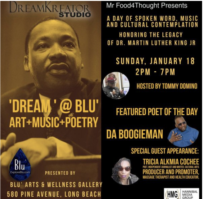 The Dream @ Blu’ celebration in Long Beach, California brings together art, music, poetry, and community spirit in honor of Dr. Martin Luther King Jr.’s legacy. Hosted by Hannibal Media Group and DreamKreator Studio at the Blu’ Arts and Wellness Gallery on Pine Avenue, the event amplifies the ideals of the Beloved Community with an afternoon of cultural expression through spoken word, acoustic jazz, and visual art.