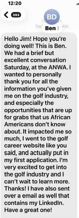 When I returned to the media center, I had a text from a young man I met on Saturday. We had discussed his career in IT and the opportunities in golf. I had encouraged him to go to the Make Golf Your Career website and view the opportunities and post his information.