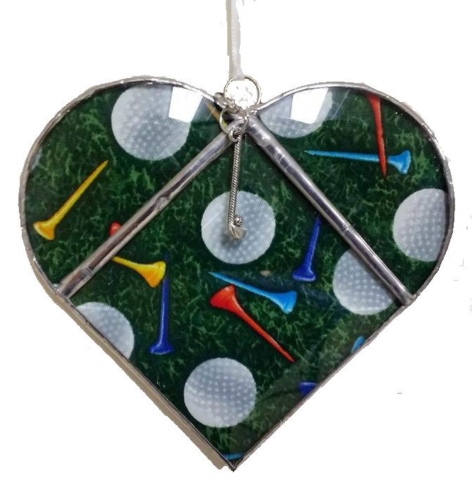 This handmade, double-sided item is a treasure to present to someone you love. It is comprised of glass, bevels, fabric, foil, wire, and ribbon and soldered together to make the perfect gift to hang almost anywhere there is sun. Dimensions: Height: 4.75 inches; Width: 5.25 inches. The heart is made with glass bevels on the front to reflect the light, and pretty shades of opaque green and white glass on the back. A golfclub charm is included. The charm can be hung on either side.