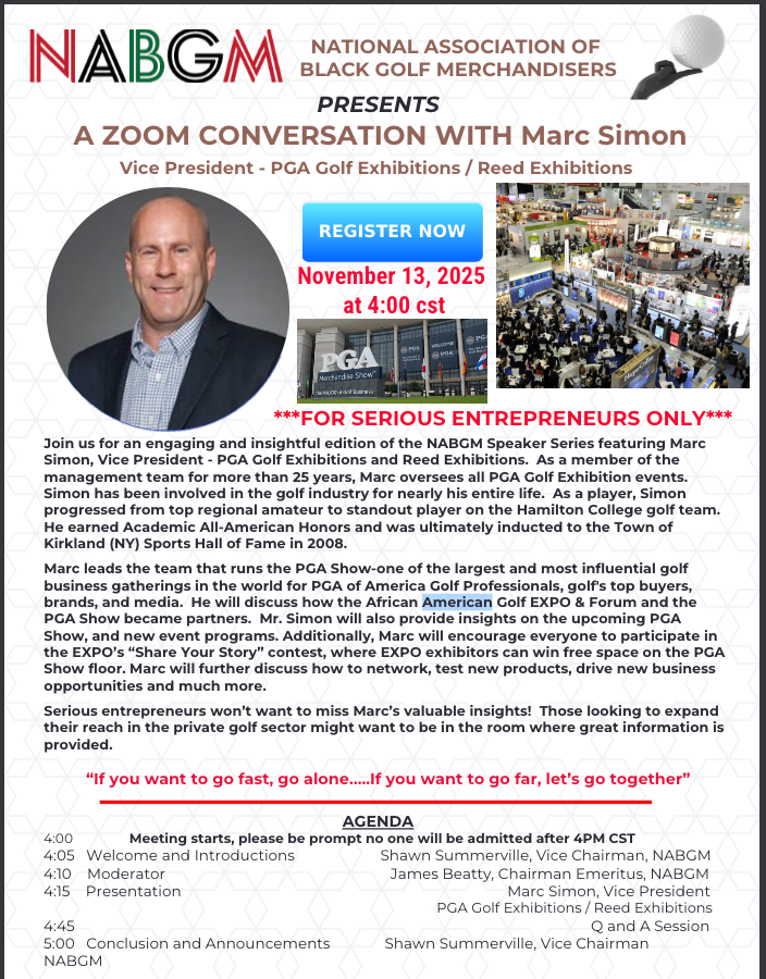 The National Association of Black Golf Merchandisers (NABGM) is continuing its mission to empower entrepreneurs and professionals in the golf industry through education and access, with its upcoming event featuring Marc Simon, Vice President of PGA Golf Exhibitions and Reed Exhibitions. The virtual discussion, scheduled for November 13, 2025, at 4:00 p.m. CST, promises to be one of the most insightful sessions in the NABGM Speaker Series .