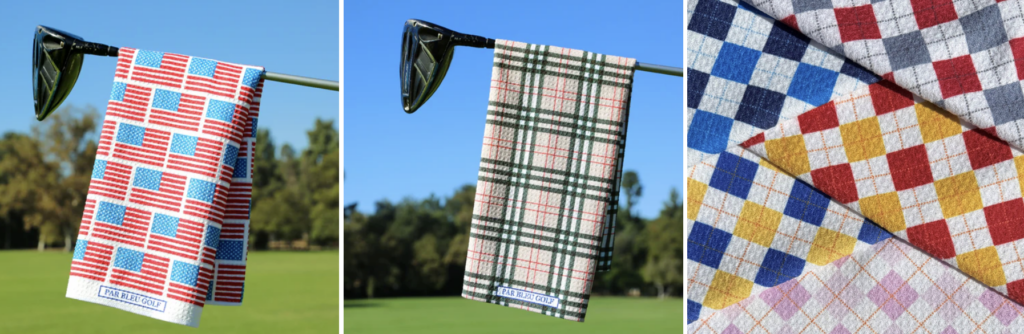 Par Bleu doesn’t treat its towels as generic gear. The brand’s strength lies in giving everyday golf accessories personality — whether you prefer the refined look of plaid, the playful tones of “Colorful Fishies,” or the vintage-style argyle.