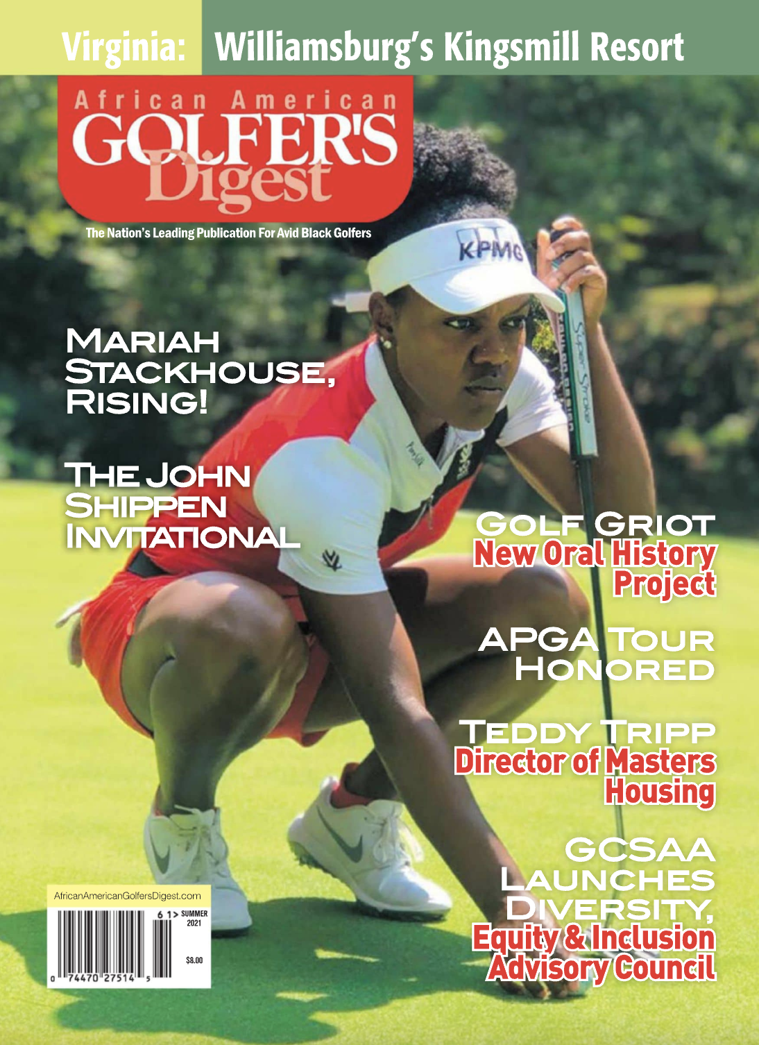 Articles and features include Mariah Stackhouse Rising, The John Shippen Invitational, Golf Griot Oral History Project, APGA Tour Honored, Teddy Tripp-Director of Masters Housing, GCSAA Launches Diversity, Equity & Inclusion Advisory Council (24 pages)