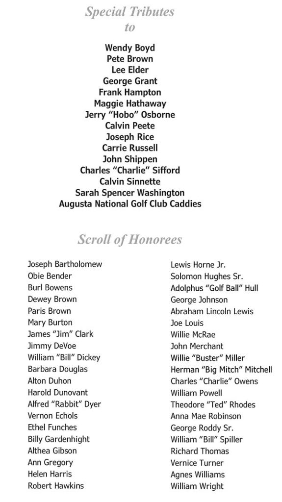 AUGUSTA, GA (March 2, 2022) ─ Lee Elder, Calvin Peete, Jerry “Hobo” Osborne, Carrie Russell, and Joseph Rice are just a few of the legends who will be honored during a special invitation-only event set to be held on Monday, March 14, 2022, at Martin Downs Golf and Country Club in Palm City, Florida.