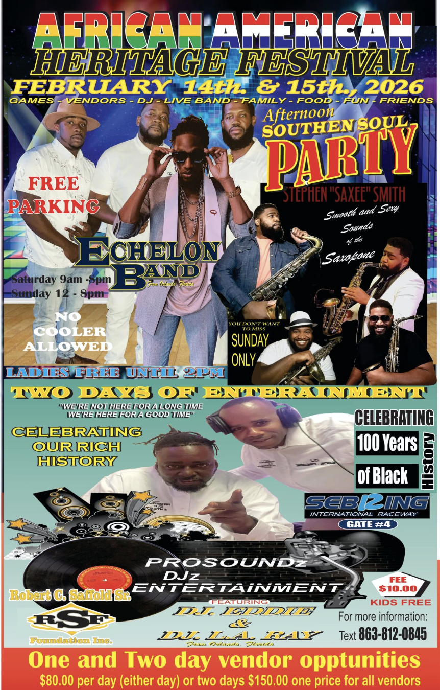 The African American Heritage Festival, scheduled for February 14–15, 2026, promises to be a vibrant celebration of culture, music, history, and community at Sebring International Raceway, Gate #4, in Sebring, Florida. Designed as a family-friendly, two-day experience, the festival brings together live entertainment, DJs, vendors, food, games, and fellowship while honoring 100 years of Black history and cultural impact.