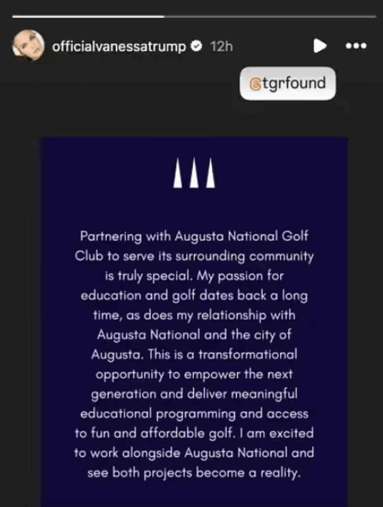 In case you haven’t heard, Vanessa Trump referenced her fledgling romance with Tiger Woods for the first time by reposting her new boyfriend’s Instagram message ahead of the Masters.